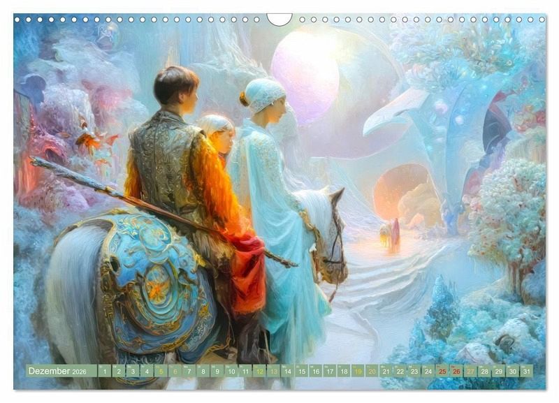 Dezember: Eine Familie reitet durch eine Märchenwelt