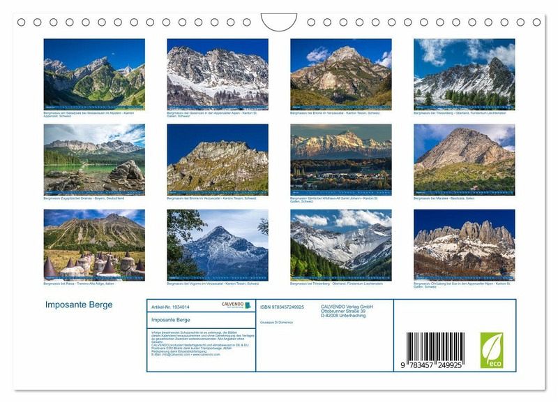 QUALITÄT - Hochwertiger Fotokalender mit 12 wunderschönen Motiven auf lichtbeständigem Bilderdruckpapier, robuste Spiralbindung mit Aufhängebügel.NACHHALTIG - deutliche Abfallreduzierung durch bedarfsgerechte Einzelstückfertigung, umweltfreundliches FSC-zertifiziertes Papier, Produktion in Deutschland, klimabewusste Logistik.PERFEKTES GESCHENK - Kalender für Freunde und Familie, für Kinder und Erwachsene, jung und alt, zu Weihnachten, Geburtstag oder zwischendurch.VIELFALT - Bildkalender in verschiedenen Formaten, z.B. DIN A5, DIN A4, DIN A3 sowie DIN A2. Ob Naturmotiv, Gemälde oder Fotos, ideal für ein persönliches Wohlfühlambiente.Schöne Bergmotive aus Deutschland, Liechtenstein, Schweiz und Italien von Autor(in): Giuseppe Di Domenico
