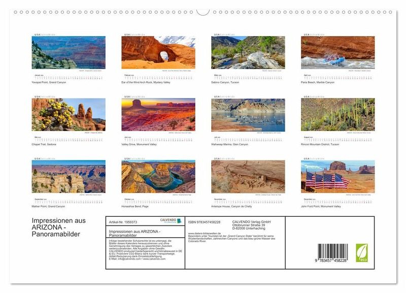 PREMIUM-LINIE - Brillanter Fotokalender mit 12 wunderschönen Motiven, Kunstdruck in Hochglanz in Museumsqualität.QUALITÄT - edle Materialien, stabile Rückwand mit 2 innovativen Einstecktaschen für eine optimale Präsentation an der Wand.NACHHALTIG - deutliche Abfallreduzierung durch bedarfsgerechte Einzelstückfertigung, umweltfreundliches FSC-zertifiziertes Papier, Produktion in Deutschland, klimabewusste Logistik.PERFEKTES GESCHENK - Kalender für Freunde und Familie, für Kinder und Erwachsene, jung und alt, zu Weihnachten, Geburtstag oder zwischendurch.Besonders unter Touristen ist der "Grand Canyon State" berühmt für seine Wüstenlandschaften, zahlreichen Canyons und das blau-grüne Wasser des Colorado River. von Autor(in): Dieter Wilczek