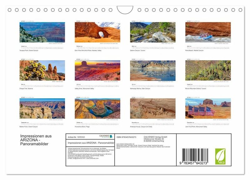 In der Kalenderserie von Dieter Wilczek "USA Extra Wide" zeigt der Erlebnisfotograf die faszinierenden Landschaften der USA in besonders ausdrucksstarken Panoramabildern. Arizona verdient seinen Namen als "Grand Canyon State" zweifellos zu Recht, wie die Aufnahmen belegen: grandiose und atemberaubende Blicke vom Hochplateau in die Tiefe, weltberühmte Wildwest Kulissen, Wüstenlandschaften, Landstriche voller Saguaro Kakteen und zahlreiche Ruinen der Pueblo Indianer.