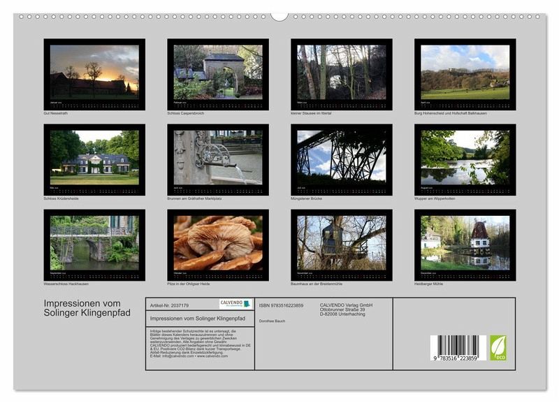 PREMIUM-LINIE - Brillanter Fotokalender mit 12 wunderschönen Motiven, Kunstdruck in Hochglanz in Museumsqualität.QUALITÄT - edle Materialien, stabile Rückwand mit 2 innovativen Einstecktaschen für eine optimale Präsentation an der Wand.NACHHALTIG - deutliche Abfallreduzierung durch bedarfsgerechte Einzelstückfertigung, umweltfreundliches FSC-zertifiziertes Papier, Produktion in Deutschland, klimabewusste Logistik.PERFEKTES GESCHENK - Kalender für Freunde und Familie, für Kinder und Erwachsene, jung und alt, zu Weihnachten, Geburtstag oder zwischendurch.Natur und Architektur entlang des Solinger Klingenpfades von Autor(in): Dorothee Bauch