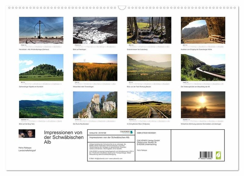 Der Kalender zeigt Landschafts- und Detailaufnahmen verbunden mit den Lichtstimmungen der vier Jahreszeiten und setzt dabei die Schwäbische Alb für den Betrachter ins "richtige Licht".