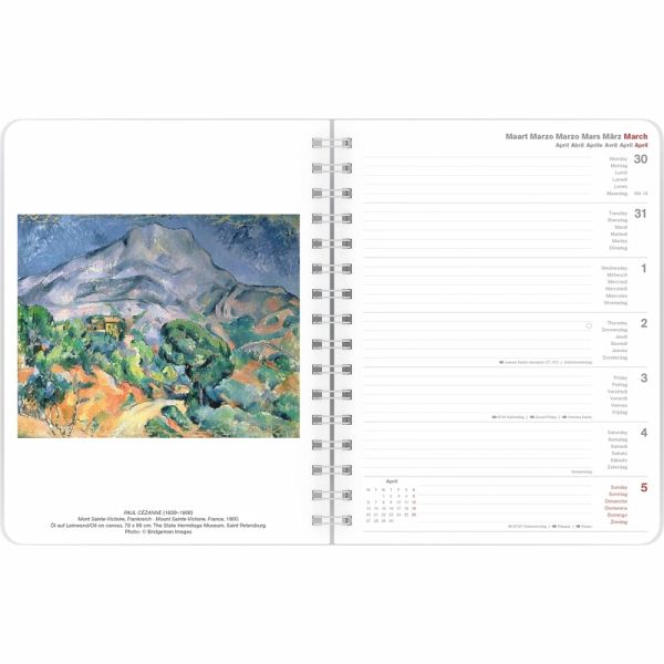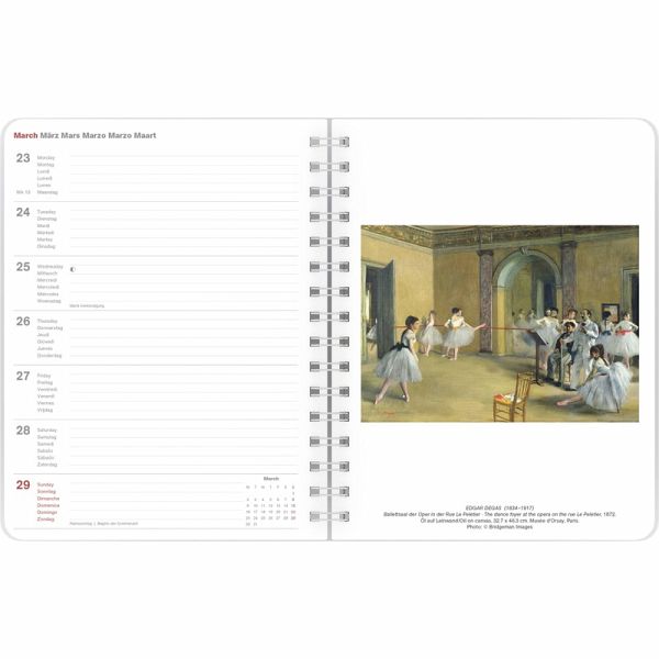 Buchkalender im Format 17 x 22 cm großzügig & praktischEine Woche auf einen Blick für optimale Übersicht6-sprachiges Kalendarium (DE/EN/FR/IT/ES/NL) mit internationalen FeiertagenMit Mondphasen, Jahresübersicht & Monatsübersichten12 Bildseiten mit impressionistischen MeisterwerkenDeluxe-Ausstattung: stabiles Plastikcover, Spiralbindung, perforierte Notizzettel, herausnehmbarer HalbjahresplanerPraktisch für Beruf, Studium, Schule & private TermineEin ideales Geschenk für Impressionismus-Fans & Kunstliebhaber