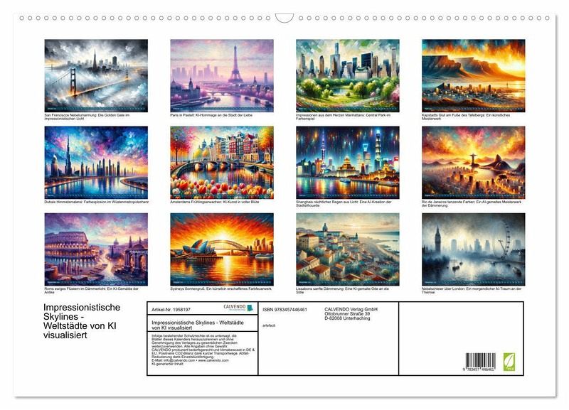 Entdecken Sie die Schönheit globaler Metropolen, eingefangen durch das kreative Auge modernster Technologie. Unsere impressionistischen Skylines, visualisiert von künstlicher Intelligenz, bringen jeden Monat einzigartige Farbexplosionen und faszinierende Perspektiven in Ihr Zuhause. Tauchen Sie ein in ein Jahr voller inspirierender Ansichten, die die Grenzen zwischen Technologie und Kunst neu definieren.