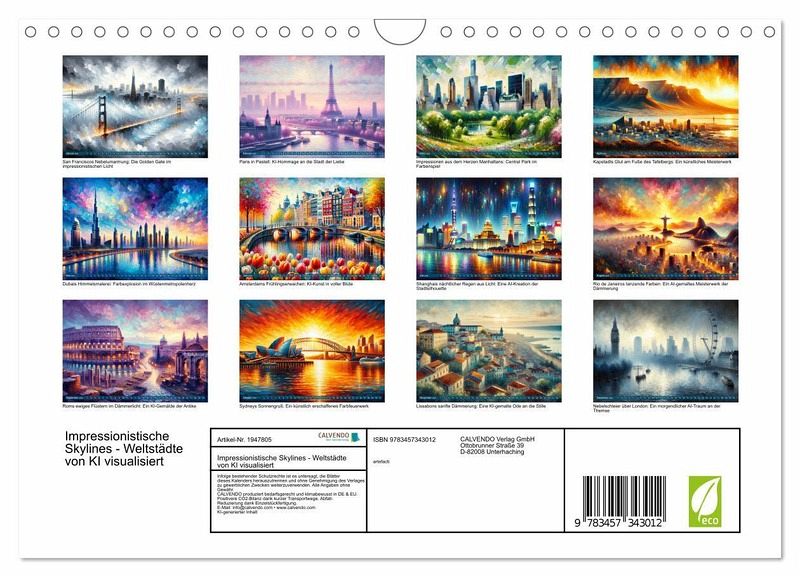 Entdecken Sie die Schönheit globaler Metropolen, eingefangen durch das kreative Auge modernster Technologie. Unsere impressionistischen Skylines, visualisiert von künstlicher Intelligenz, bringen jeden Monat einzigartige Farbexplosionen und faszinierende Perspektiven in Ihr Zuhause. Tauchen Sie ein in ein Jahr voller inspirierender Ansichten, die die Grenzen zwischen Technologie und Kunst neu definieren.