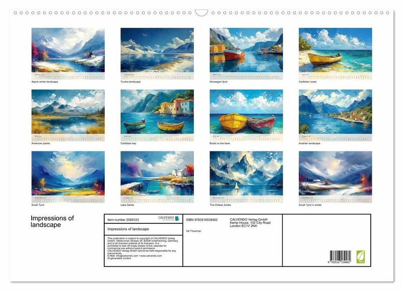 QUALITY - High-quality photo calendar with 12 beautiful images on light-resistant paper, robust spiral binding with hanger.SUSTAINABLE - Significant waste reduction due to print-on-demand production, environmentally friendly FSC-certified paper, produced in the UK, climate-conscious logistical processes.PERFECT GIFT - calendars for friends and family, for children, all ages and all occasions, from Christmas to birthdays and everything in between.LOTS OF CHOICE - Wall calendars in different sizes (DIN A4 and DIN A3), for any topic and personal taste, featuring photography, painting and illustrations.The calendar includes 12 beautiful Impressionistic landscape images from around the world., author: Val Thoermer