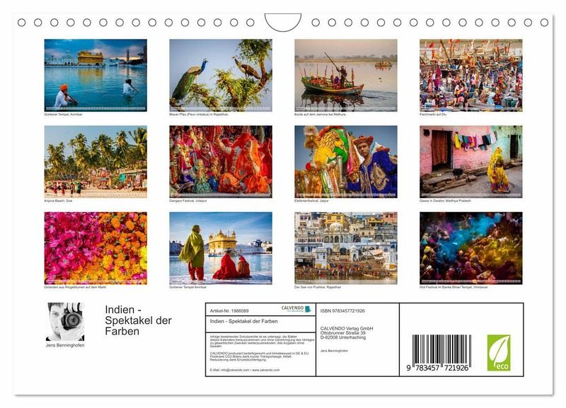 QUALITÄT - Hochwertiger Fotokalender mit 12 wunderschönen Motiven auf lichtbeständigem Bilderdruckpapier, robuste Spiralbindung mit Aufhängebügel.NACHHALTIG - deutliche Abfallreduzierung durch bedarfsgerechte Einzelstückfertigung, umweltfreundliches FSC-zertifiziertes Papier, Produktion in Deutschland, klimabewusste Logistik.PERFEKTES GESCHENK - Kalender für Freunde und Familie, für Kinder und Erwachsene, jung und alt, zu Weihnachten, Geburtstag oder zwischendurch.VIELFALT - Bildkalender in verschiedenen Formaten, z.B. DIN A5, DIN A4, DIN A3 sowie DIN A2. Ob Naturmotiv, Gemälde oder Fotos, ideal für ein persönliches Wohlfühlambiente.Intensiv, leuchtend, bunt - das ist Indien! von Autor(in): Jens Benninghofen