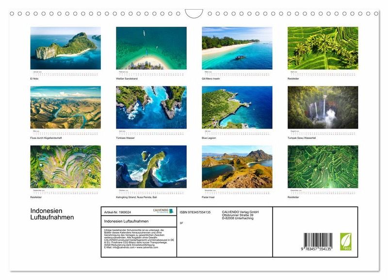 Indonesien ist ein unglaublich faszinierender Ort. Bestehend aus mehr als 17.000 Inseln bietet das Land von oben gesehen spektakuläre Bilder. Dieser Kalender zeigt 12 von diesen atemberaubenden Aufnahmen.