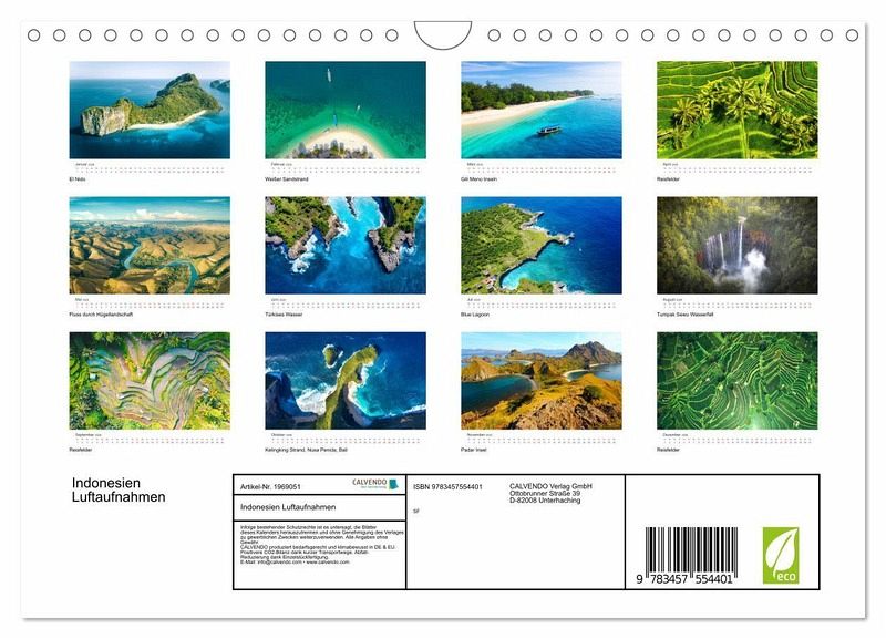 Indonesien ist ein unglaublich faszinierender Ort. Bestehend aus mehr als 17.000 Inseln bietet das Land von oben gesehen spektakuläre Bilder. Dieser Kalender zeigt 12 von diesen atemberaubenden Aufnahmen.