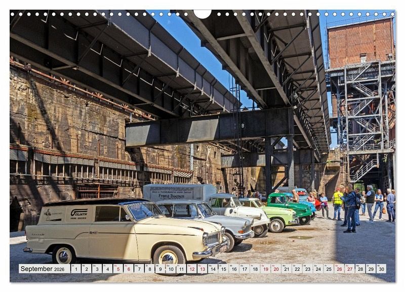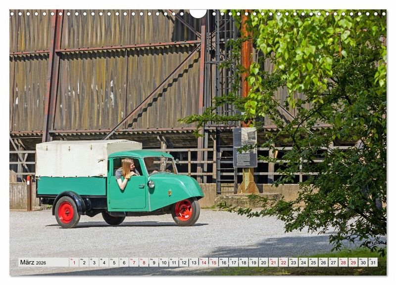 März: Zeitgemäß - ein Goliath Oldtimer vor dem Doppelkühlwerk