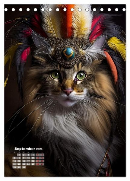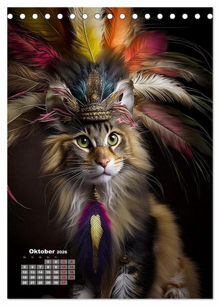 Oktober: Braun weiße Langhaarkatze mit einem majestätischen bunten Kopfschmuck aus farbigen langen Federn