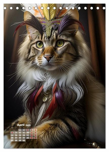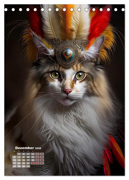 Februar: Weiß rot braune Langhaarkatze trägt ein elegantes Inka Diadem und dazu einige Federn