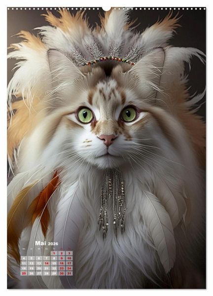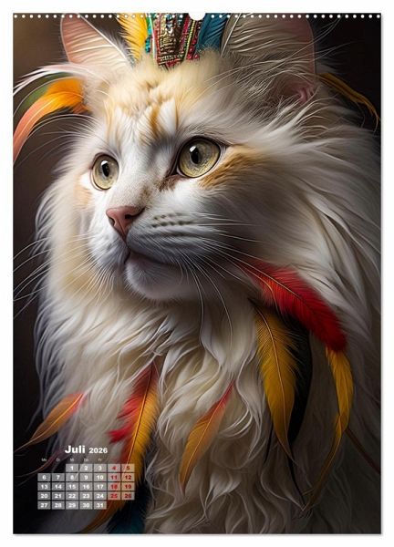 Oktober: Braun weiße Langhaarkatze mit einem majestätischen bunten Kopfschmuck aus farbigen langen Federn