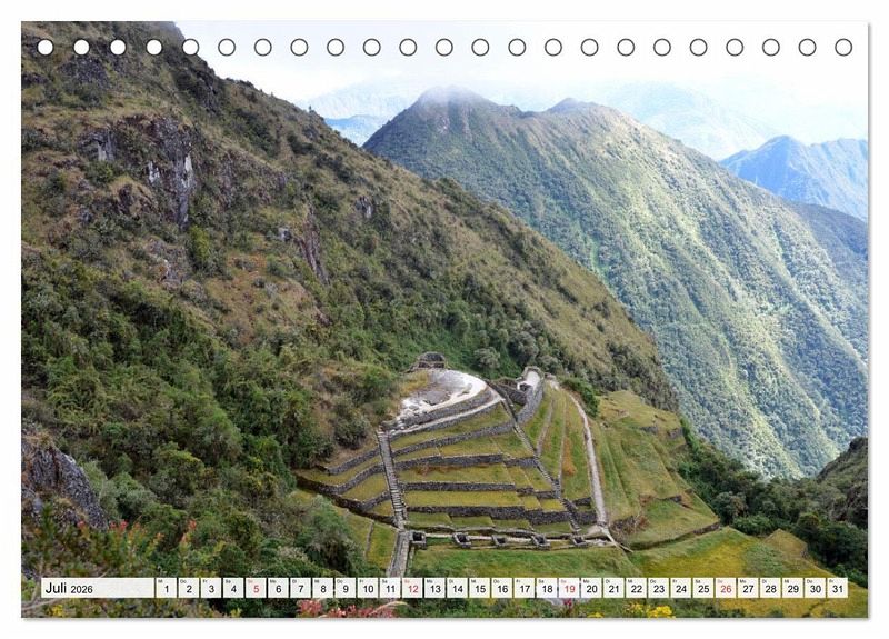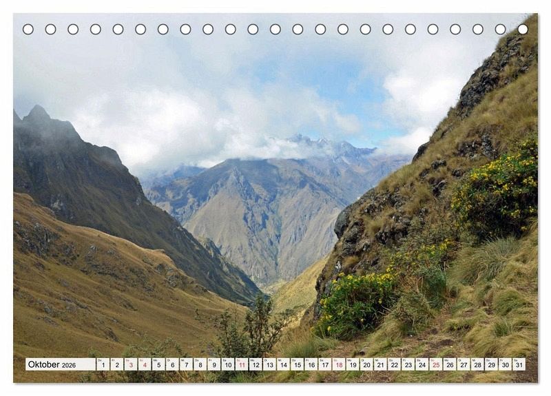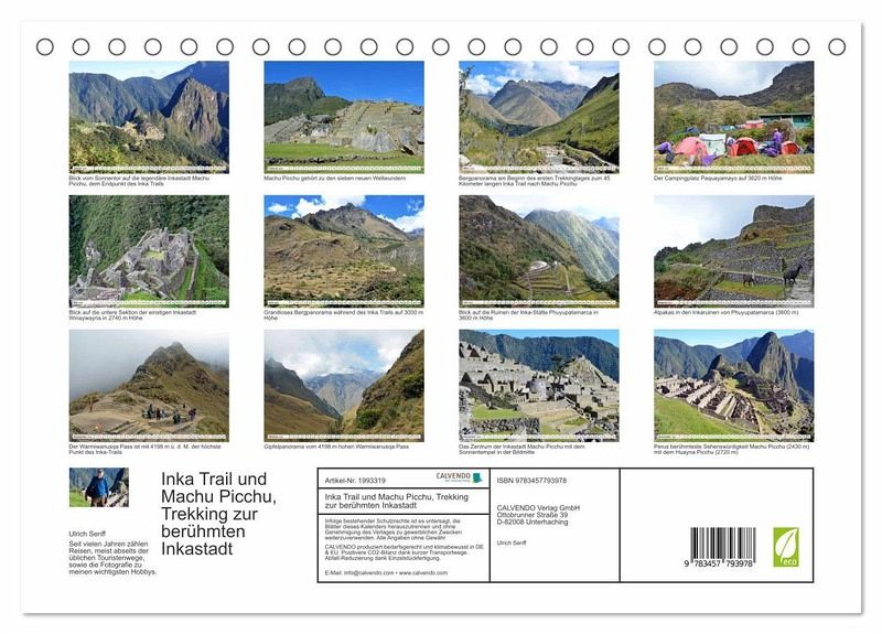 Der anspruchsvolle Inka Trail, Südamerikas berühmteste und meistbegangene Trekkingroute, führt vier Tage lang inmitten einer spektakulären Berglandschaft über drei Pässe mit Höhen von 4198 m, 3998 m und 3700 m. An der Strecke liegen mehrere Ruinenstädte der Inkas. Höhepunkt und Abschluss der großartigen Wanderung ist die berühmte, sehr gut erhaltene Inkastadt Machu Picchu, eines der Sieben Neuen Weltwunder. Der Autor präsentiert im Kalender einige seiner beeindruckenden Fotos vom Inka Trail und von Machu Picchu.