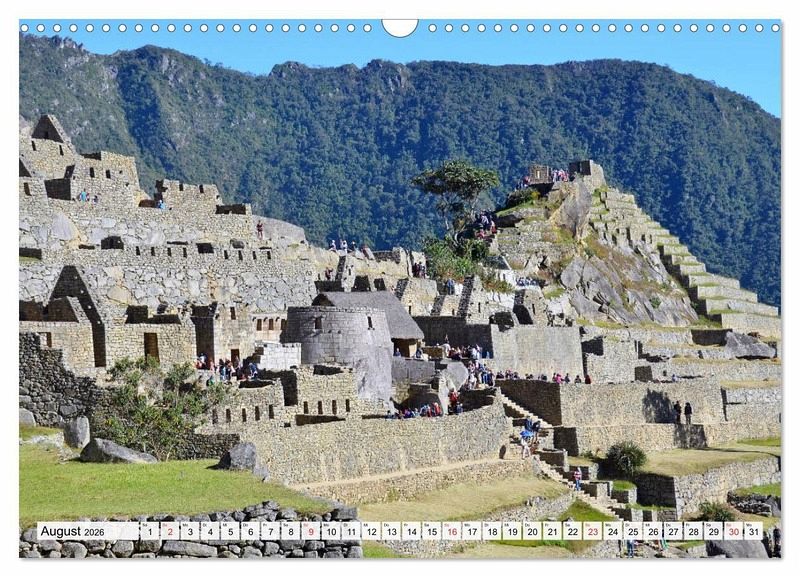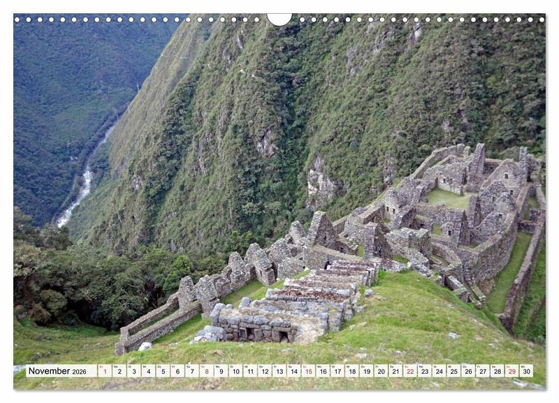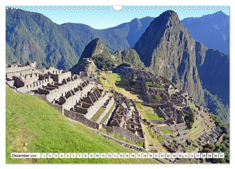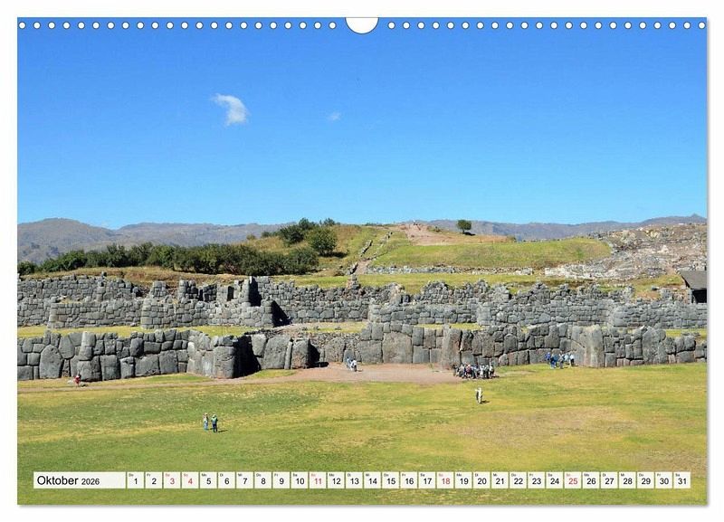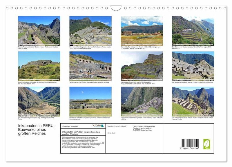 Die Inka herrschten in Südamerika vom 13. bis 16. Jahrhundert. Beeindruckende Bauwerke, Heiligtümer, Festungsbauten und Städte, sowie ein zirka 40 000 Kilometer langes Straßennetz sind großartige Leistungen der Inka, obwohl Hilfsmittel wie Rad, Wagen oder andere Transportmittel unbekannt waren. Der Autor präsentiert im Kalender Fotos von grandiosen baulichen Zeugnissen aus dem Region um Cusco, der einstigen Hauptstadt des mächtigen Inka-Reiches, vom Inka-Trail, der bekanntesten Trekkingtour in Südamerika und natürlich von Machu Picchu, dem touristischen Höhepunkt Perus, eines der Sieben Neuen Weltwunder.
