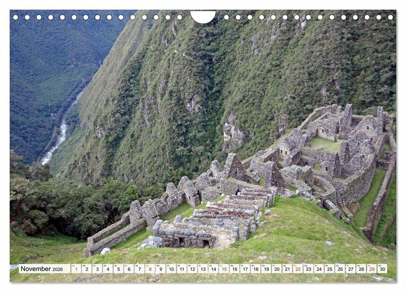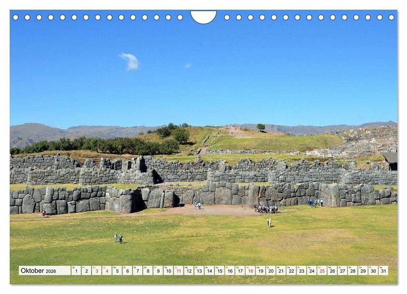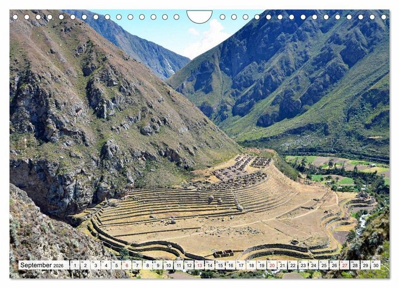 Die Inka herrschten in Südamerika vom 13. bis 16. Jahrhundert. Beeindruckende Bauwerke, Heiligtümer, Festungsbauten und Städte, sowie ein zirka 40 000 Kilometer langes Straßennetz sind großartige Leistungen der Inka, obwohl Hilfsmittel wie Rad, Wagen oder andere Transportmittel unbekannt waren. Der Autor präsentiert im Kalender Fotos von grandiosen baulichen Zeugnissen aus dem Region um Cusco, der einstigen Hauptstadt des mächtigen Inka-Reiches, vom Inka-Trail, der bekanntesten Trekkingtour in Südamerika und natürlich von Machu Picchu, dem touristischen Höhepunkt Perus, eines der Sieben Neuen Weltwunder.