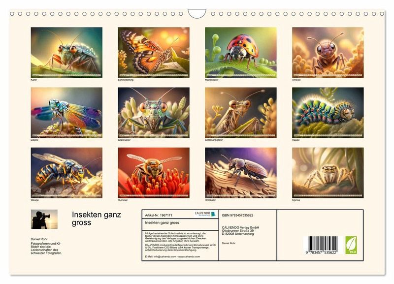 QUALITÄT - Hochwertiger Fotokalender mit 12 wunderschönen Motiven auf lichtbeständigem Bilderdruckpapier, robuste Spiralbindung mit Aufhängebügel.NACHHALTIG - deutliche Abfallreduzierung durch bedarfsgerechte Einzelstückfertigung, umweltfreundliches FSC-zertifiziertes Papier, Produktion in Deutschland, klimabewusste Logistik.PERFEKTES GESCHENK - Kalender für Freunde und Familie, für Kinder und Erwachsene, jung und alt, zu Weihnachten, Geburtstag oder zwischendurch.VIELFALT - Bildkalender in verschiedenen Formaten, z.B. DIN A5, DIN A4, DIN A3 sowie DIN A2. Ob Naturmotiv, Gemälde oder Fotos, ideal für ein persönliches Wohlfühlambiente.Kleine Insekten im Grossformat von Autor(in): Daniel Rohr