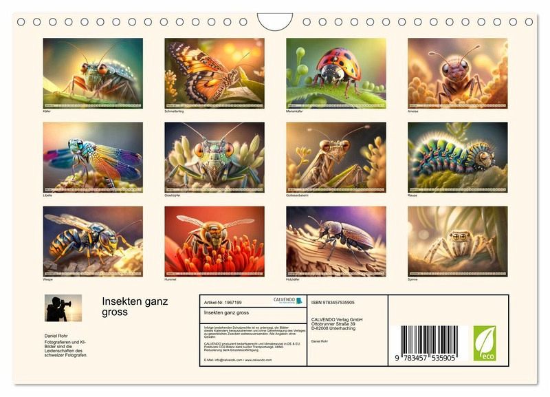 QUALITÄT - Hochwertiger Fotokalender mit 12 wunderschönen Motiven auf lichtbeständigem Bilderdruckpapier, robuste Spiralbindung mit Aufhängebügel.NACHHALTIG - deutliche Abfallreduzierung durch bedarfsgerechte Einzelstückfertigung, umweltfreundliches FSC-zertifiziertes Papier, Produktion in Deutschland, klimabewusste Logistik.PERFEKTES GESCHENK - Kalender für Freunde und Familie, für Kinder und Erwachsene, jung und alt, zu Weihnachten, Geburtstag oder zwischendurch.VIELFALT - Bildkalender in verschiedenen Formaten, z.B. DIN A5, DIN A4, DIN A3 sowie DIN A2. Ob Naturmotiv, Gemälde oder Fotos, ideal für ein persönliches Wohlfühlambiente.Kleine Insekten im Grossformat von Autor(in): Daniel Rohr