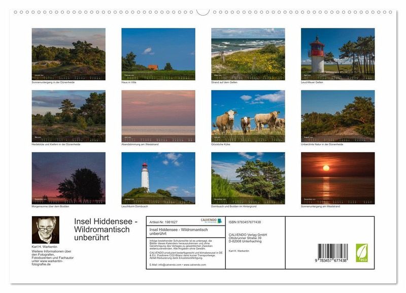 Hiddensee ist eine der letzten naturbelassenen Inseln an der Deutschen Ostseeküste. Der Kalender des international tätigen Reisefotografen Karl H. Warkentin zeigt die unberührte Natur und Schönheit der Insel in zwölf besonderen Motiven vom Dornbusch im Norden bis zum Gellen im Süden und vom Strand im Westen bis zum Bodden im Osten.