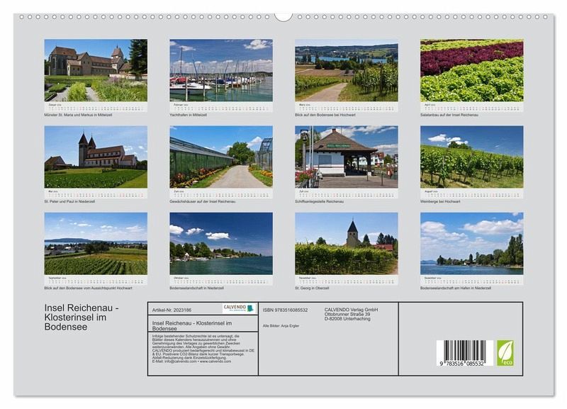 Die Insel Reichenau ist die größte Insel im Bodensee. Sie liegt in der Ferienregion des Untersees und ist auch bekannt als Klosterinsel und Gemüseinsel. Wegen ihrer Kirchen und Kunstschätzen ist sie zudem auf der Welterbeliste der UNESCO verzeichnet. Dieser Kalender nimmt Sie mit auf einen Streifzug - vorbei am Yachthafen in Mittelzell, dem Klostergarten mit Münster St. Maria und Markus oder wandern Sie zum Beispiel mit durch die Weinberge und genießen anschließend einen atemberaubenden Rundblick auf den Bodensee. Entdecken Sie mit diesen ausgesuchten Fotografien die Vielseitigkeit dieser Region.