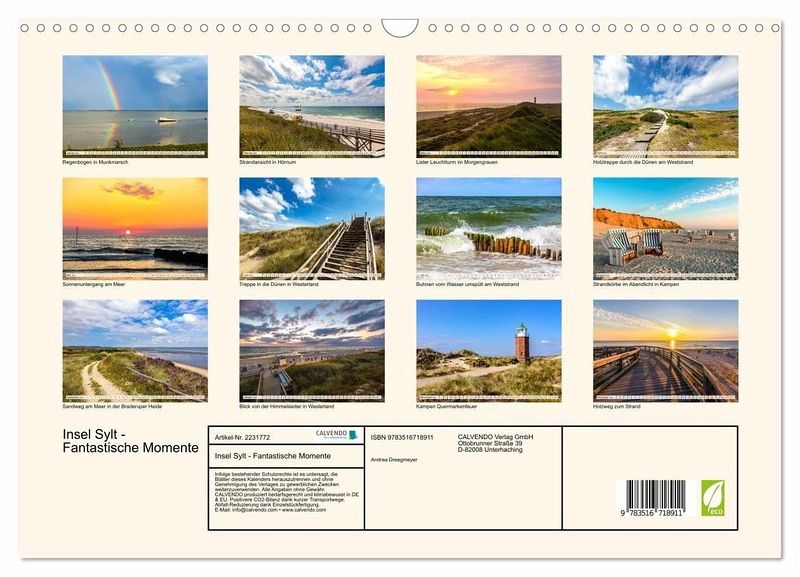 QUALITÄT - Hochwertiger Fotokalender mit 12 wunderschönen Motiven auf lichtbeständigem Bilderdruckpapier, robuste Spiralbindung mit Aufhängebügel.NACHHALTIG - deutliche Abfallreduzierung durch bedarfsgerechte Einzelstückfertigung, umweltfreundliches FSC-zertifiziertes Papier, Produktion in Deutschland, klimabewusste Logistik.PERFEKTES GESCHENK - Kalender für Freunde und Familie, für Kinder und Erwachsene, jung und alt, zu Weihnachten, Geburtstag oder zwischendurch.VIELFALT - Bildkalender in verschiedenen Formaten, z.B. DIN A5, DIN A4, DIN A3 sowie DIN A2. Ob Naturmotiv, Gemälde oder Fotos, ideal für ein persönliches Wohlfühlambiente.Zauberhafte Lichtstimmungen am Meer von Autor(in): Andrea Dreegmeyer
