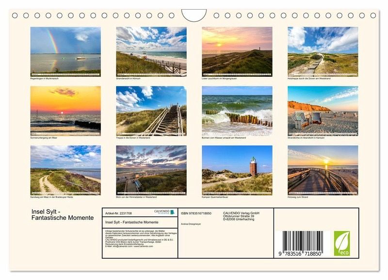 QUALITÄT - Hochwertiger Fotokalender mit 12 wunderschönen Motiven auf lichtbeständigem Bilderdruckpapier, robuste Spiralbindung mit Aufhängebügel.NACHHALTIG - deutliche Abfallreduzierung durch bedarfsgerechte Einzelstückfertigung, umweltfreundliches FSC-zertifiziertes Papier, Produktion in Deutschland, klimabewusste Logistik.PERFEKTES GESCHENK - Kalender für Freunde und Familie, für Kinder und Erwachsene, jung und alt, zu Weihnachten, Geburtstag oder zwischendurch.VIELFALT - Bildkalender in verschiedenen Formaten, z.B. DIN A5, DIN A4, DIN A3 sowie DIN A2. Ob Naturmotiv, Gemälde oder Fotos, ideal für ein persönliches Wohlfühlambiente.Zauberhafte Lichtstimmungen am Meer von Autor(in): Andrea Dreegmeyer