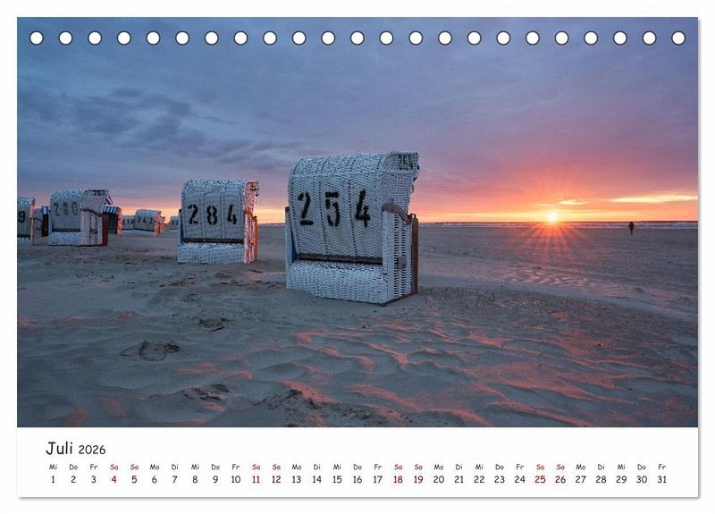 Juli: Die Strandkörbe leuchten im Rot der Abendsonne.