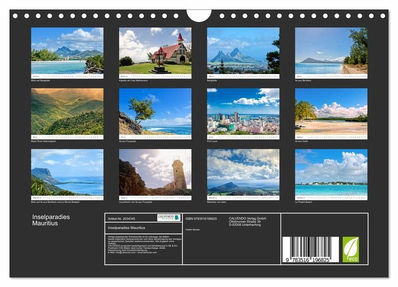 QUALITÄT - Hochwertiger Fotokalender mit 12 wunderschönen Motiven auf lichtbeständigem Bilderdruckpapier, robuste Spiralbindung mit Aufhängebügel.NACHHALTIG - deutliche Abfallreduzierung durch bedarfsgerechte Einzelstückfertigung, umweltfreundliches FSC-zertifiziertes Papier, Produktion in Deutschland, klimabewusste Logistik.PERFEKTES GESCHENK - Kalender für Freunde und Familie, für Kinder und Erwachsene, jung und alt, zu Weihnachten, Geburtstag oder zwischendurch.VIELFALT - Bildkalender in verschiedenen Formaten, z.B. DIN A5, DIN A4, DIN A3 sowie DIN A2. Ob Naturmotiv, Gemälde oder Fotos, ideal für ein persönliches Wohlfühlambiente.Mauritius - Inselparadies im Indischen Ozean von Autor(in): Stefan Becker