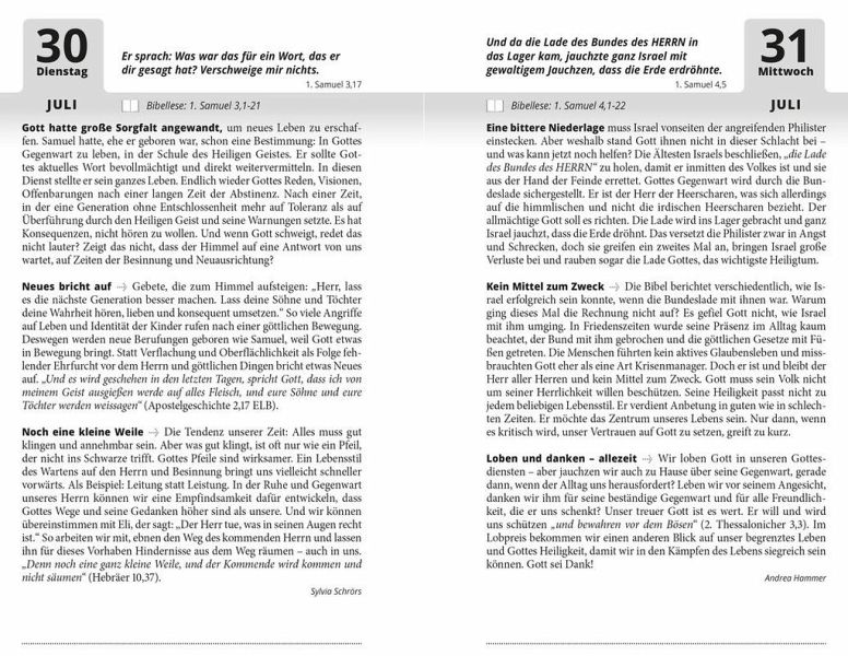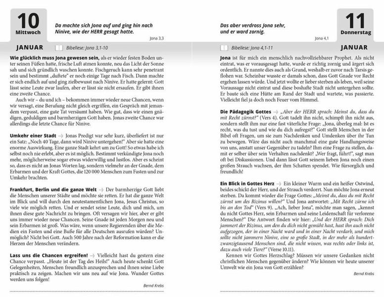Der Andachtskalender begleitet eine tägliche Bibellese. Mehr als 230 Autoren aus dem Bund Freikirchlicher Pfingstgemeinden, der Gemeinde Gottes, der Schweizerischen Pfingstmission und der Freien Christengemeinden Österreichs haben Andachten in ihrem ganz persönlichen Stil beigetragen. Was alle verbindet: aus Gottes Wort inspirierte und inspirierende Impulse weiterzugeben. Egal, ob jemand die Bibel zum ersten Mal liest oder langjähriger "Bibelforscher" ist: Für jeden ist etwas dabei.