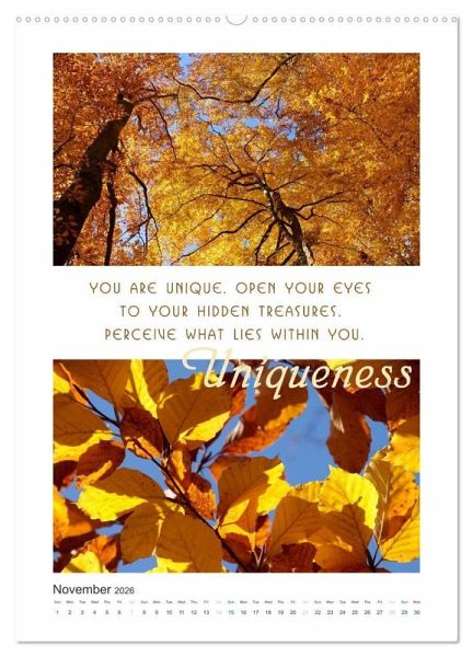 Every month, there is an inspiring message awaiting you along with fascinating photographs from a close-up and long-distance perspective. This beautiful calendar will accompany you through the year with profound messages and wisdoms of life. Enrich your life. Pause for a moment. Find balance, vital energy, love, health, joy and strength.