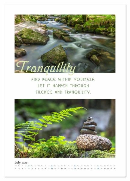 Every month, there is an inspiring message awaiting you along with fascinating photographs from a close-up and long-distance perspective. This beautiful calendar will accompany you through the year with profound messages and wisdoms of life. Enrich your life. Pause for a moment. Find balance, vital energy, love, health, joy and strength.
