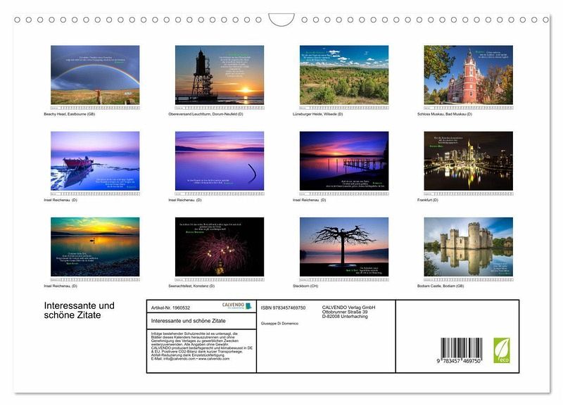 Der Fotograf Giuseppe Di Domenico hat dreizehn schöne Fotos mit Zitate zusamengeführt, so dass sich in diesem Jahreskalender nicht nur stimmungsvolle Fotos befinden, sondern ebenso auserwählte Zitate und Weisheiten, welche für jeden Betrachter neue Impulse erschaffen.