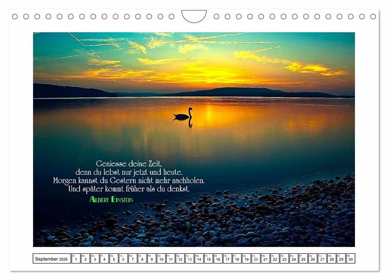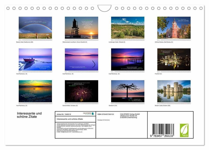 Der Fotograf Giuseppe Di Domenico hat dreizehn schöne Fotos mit Zitate zusamengeführt, so dass sich in diesem Jahreskalender nicht nur stimmungsvolle Fotos befinden, sondern ebenso auserwählte Zitate und Weisheiten, welche für jeden Betrachter neue Impulse erschaffen.
