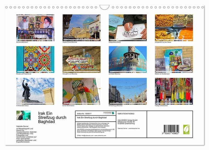 QUALITÄT - Hochwertiger Fotokalender mit 12 wunderschönen Motiven auf lichtbeständigem Bilderdruckpapier, robuste Spiralbindung mit Aufhängebügel.NACHHALTIG - deutliche Abfallreduzierung durch bedarfsgerechteEinzelstückfertigung, umweltfreundliches FSC-zertifiziertes Papier, Produktion in Deutschland, klimabewusste Logistik.PERFEKTES GESCHENK - Kalender für Freunde und Familie, für Kinder und Erwachsene, jung und alt, zu Weihnachten, Geburtstag oder zwischendurch.VIELFALT - Bildkalender in verschiedenen Formaten, z.B. DIN A5, DIN A4, DIN A3 sowie DIN A2. Ob Naturmotiv, Gemälde oder Fotos, ideal für ein persönliches Wohlfühlambiente.Baghdad bietet einen faszinierenden Einblick in die vielfältige Kultur des Irak. von Autor(in): Gabriele Gerner-Haudum