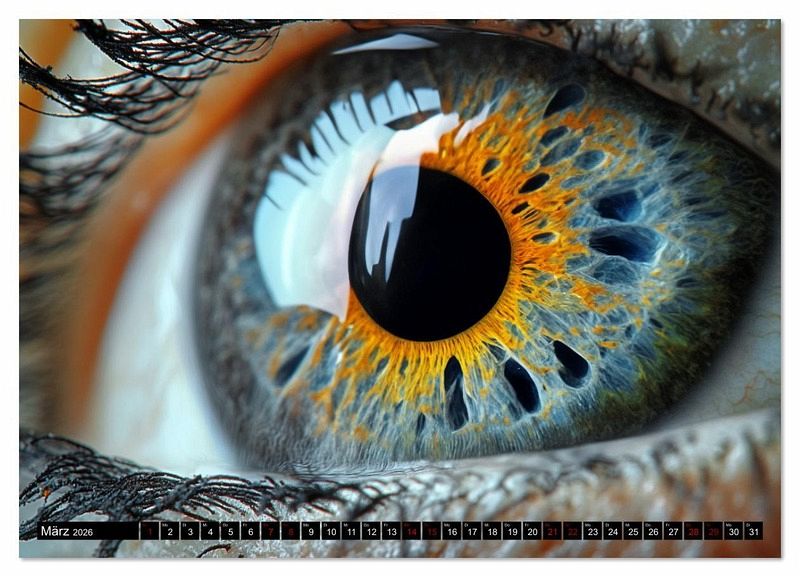 Iris-Auge - ein außergewöhnlicher Design-Kalender für Erwachsene mit faszinierenden Irisbildern, Augen, intensiven Augenfarben und brillanten Pupillen. Jeder Monat zeigt kunstvolle Irisfotos - inspiriert von echter Irisfotografie und erstellt mit modernster KI-Generation. Der Kunstkalender eignet sich perfekt als Dekoration für das Wohnzimmer, als Kalender für die Arztpraxis eines Augenarztes oder Bürokalender. Ob als Eyecatcher beim Augen-Optiker oder als Wohnzimmer Deko Wand Bild - dieser Dekokalender zieht alle Blicke auf sich. Grüne Augen, blaue Augen, ausdrucksstarke Iris in beeindruckender Detailtiefe machen diesen Kunstkalender zur stilvollen Wohnungsdekoration. Ein ideales Geschenk für Frauen, Männer, Kunstliebhaber und als Weihnachtsgeschenk - modern, kreativ und einzigartig!