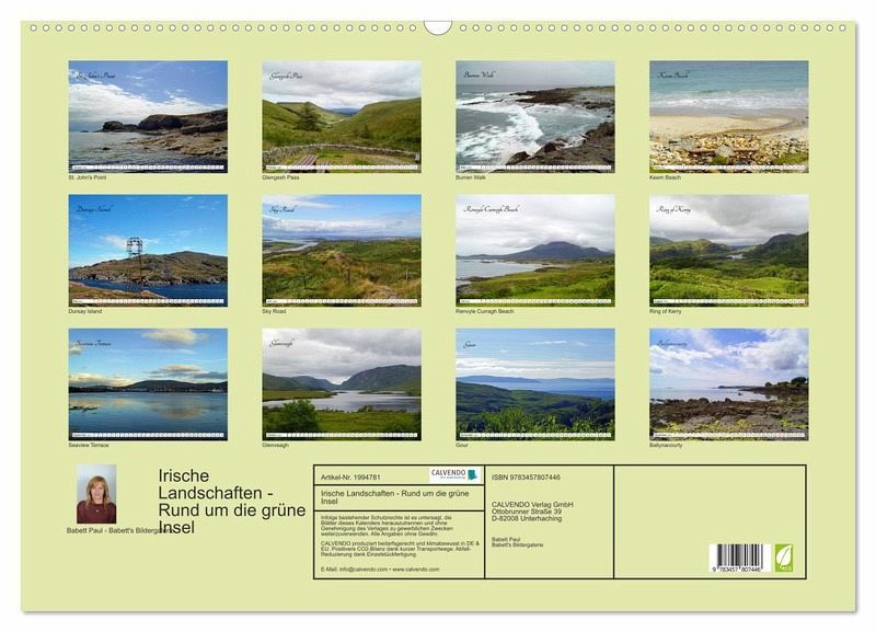QUALITÄT - Hochwertiger Fotokalender mit 12 wunderschönen Motiven auf lichtbeständigem Bilderdruckpapier, robuste Spiralbindung mit Aufhängebügel.NACHHALTIG - deutliche Abfallreduzierung durch bedarfsgerechte Einzelstückfertigung, umweltfreundliches FSC-zertifiziertes Papier, Produktion in Deutschland, klimabewusste Logistik.PERFEKTES GESCHENK - Kalender für Freunde und Familie, für Kinder und Erwachsene, jung und alt, zu Weihnachten, Geburtstag oder zwischendurch.VIELFALT - Bildkalender in verschiedenen Formaten, z.B. DIN A5, DIN A4, DIN A3 sowie DIN A2. Ob Naturmotiv, Gemälde oder Fotos, ideal für ein persönliches Wohlfühlambiente.Der Kalender nimmt Sie mit auf eine Reise durch Irland und zeigt ihnen beeindruckende Landschaften von Autor(in): Babett's Bildergalerie