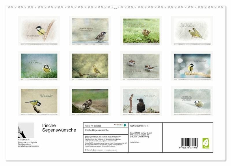 In diesem Kalender finden Sie Fotografien von heimischen Vogelarten, fantasievoll und wunderschön bearbeitet. Zusätzlich wurden diese ansprechenden Bilder mit irischen Segenswünschen versehen. Die Redaktion hat diesen Kalender für die CALVENDO Gold-Edition ausgewählt.