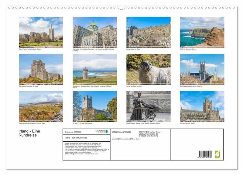 Raue Landschaften, steile Klippen und märchenhafte Bauten, der Kalender zeigt Irland von seiner spannensten Seite. Bekannte Wahrzeichen und spannende, kaum bekannte Sehenswürdigkeiten Irlands, begleiten Sie durch das Jahr.