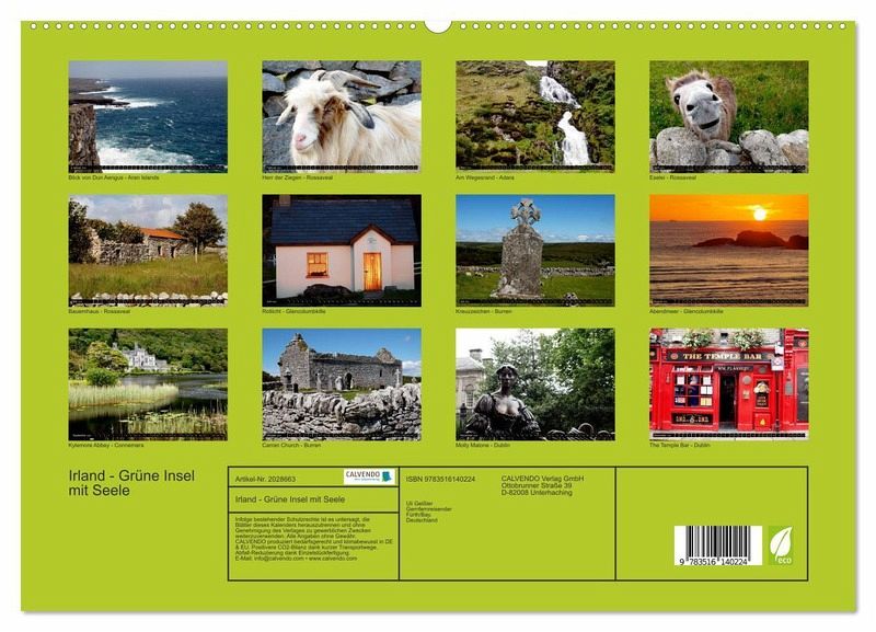 Der Kalender lädt auf die raue und doch so stille Insel ein, zeigt die unbekannten Schönheiten und Ansichten, Orte und Entdeckungen vorwiegend an der Westküste von Donnegal und Connemara.