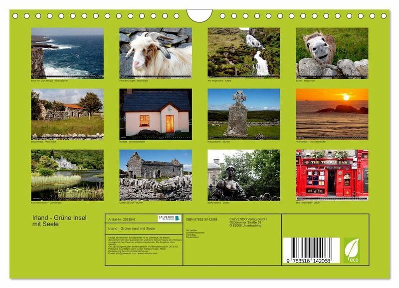 Der Kalender lädt auf die raue und doch so stille Insel ein, zeigt die unbekannten Schönheiten und Ansichten, Orte und Entdeckungen vorwiegend an der Westküste von Donnegal und Connemara.