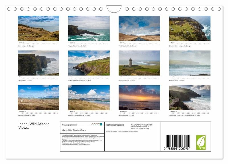 QUALITÄT - Hochwertiger Fotokalender mit 12 wunderschönen Motiven auf lichtbeständigem Bilderdruckpapier, robuste Spiralbindung mit Aufhängebügel.NACHHALTIG - deutliche Abfallreduzierung durch bedarfsgerechte Einzelstückfertigung, umweltfreundliches FSC-zertifiziertes Papier, Produktion in Deutschland, klimabewusste Logistik.PERFEKTES GESCHENK - Kalender für Freunde und Familie, für Kinder und Erwachsene, jung und alt, zu Weihnachten, Geburtstag oder zwischendurch.VIELFALT - Bildkalender in verschiedenen Formaten, z.B. DIN A5, DIN A4, DIN A3 sowie DIN A2. Ob Naturmotiv, Gemälde oder Fotos, ideal für ein persönliches Wohlfühlambiente.An der Westküste Irlands von Autor(in): Markus Wagner