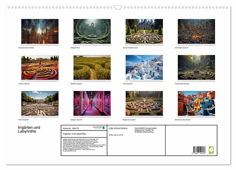 QUALITÄT - Hochwertiger Fotokalender mit 12 wunderschönen Motiven auf lichtbeständigem Bilderdruckpapier, robuste Spiralbindung mit Aufhängebügel.NACHHALTIG - deutliche Abfallreduzierung durch bedarfsgerechte Einzelstückfertigung, umweltfreundliches FSC-zertifiziertes Papier, Produktion in Deutschland, klimabewusste Logistik.PERFEKTES GESCHENK - Kalender für Freunde und Familie, für Kinder und Erwachsene, jung und alt, zu Weihnachten, Geburtstag oder zwischendurch.VIELFALT - Bildkalender in verschiedenen Formaten, z.B. DIN A5, DIN A4, DIN A3 sowie DIN A2. Ob Naturmotiv, Gemäldeoder Fotos, ideal für ein persönliches Wohlfühlambiente.Ein Labyrinth soll den Wegfinder verwirren und herausfordern. In einem Irrgarten hingegen soll der Wegfinder sich verlieren. von Autor(in): Steffen Gierok ; Magik Artist Design