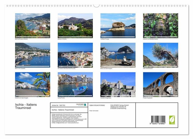 Erleben Sie mit diesem Kalender Monat für Monat die unterschiedlichsten Eindrücke von der Trauminsel Ischia. Auf dieser wunderschönen Insel Italiens findet man gemütliche Orte wie Sant Angelo, aber auch lebendige Städte wie Ischia Porto. Egal ob reizvolle Landschaften, beschauliche Dörfer, farbenfrohe Natur oder einfach nur das " la dolce vita " Italiens - Ischia ist immer eine Reise wert.