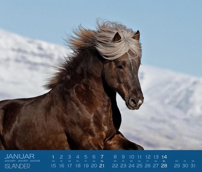 Islandpferde fotografiert auf der Vulkaninsel ISLANDIslandpferde sind geprägt von einer Natur, die unvergleichlich schön, aber gleichzeitig hart und unerbittlich ist. In ihren Mähnen fangen sie die Magie der Mitternachtssonne ein und ihre Hufe schweben über den schwarzen Lavasand. Wer jemals Island besucht hat und auf einem Isländer durch die unberührte Vulkanlandschaft geritten ist, wird dieses Erlebnis niemals vergessen und für den Rest seines Lebens im Herzen tragen. Man fühlt sich losgelöst von Zeit und Raum und ist im Einklang mit der Natur. Auf dem Rücken der Pferde nimmt man seine Umwelt einfach intensiver wahr, man spürt ihren Atem und passt sich ihren Bewegungen an. Island - seine Landschaft, seine Menschen und nicht zuletzt die wundervollen Pferde haben eine Magie, der man kaum widerstehen kann.Gabriele Boiselle und ihrer isländischen Kollegin Kolbrún Grétarsdottir liegt es sehr am Herzen, die besondere Faszination Islands in emotionalen Bildern einzufangen und Dich mitdiesem Kalender für Island und seine Pferde zu begeistern.Dieser Kalender bietet Dir 24 wunderschöne Monatsmotive - für jeden Monat stehen Dir zwei Motive zu Auswahl! So kannst Du jeden Monat Dein persönliches Lieblingsmotiv auswählen! Format: 46 x 39 cmHinweis: Dieser Artikel kann nur an eine deutsche Lieferadresse ausgeliefert werden.