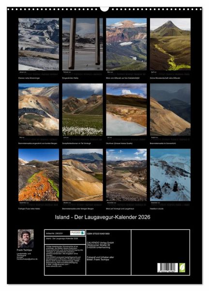 QUALITÄT - Hochwertiger Fotokalender mit 12 wunderschönen Motiven auf lichtbeständigem Bilderdruckpapier, robuste Spiralbindung mit Aufhängebügel.NACHHALTIG - deutliche Abfallreduzierung durch bedarfsgerechte Einzelstückfertigung, umweltfreundliches FSC-zertifiziertes Papier, Produktion in Deutschland, klimabewusste Logistik.PERFEKTES GESCHENK - Kalender für Freunde und Familie, für Kinder und Erwachsene, jung und alt, zu Weihnachten, Geburtstag oder zwischendurch.VIELFALT - Bildkalender in verschiedenen Formaten, z.B. DIN A5, DIN A4, DIN A3 sowie DIN A2. Ob Naturmotiv, Gemälde oder Fotos, ideal für ein persönliches Wohlfühlambiente.Impressionen vom beliebtesten Wanderweg Islands, dem Laugavegur. von Autor(in): Frank Tschöpe