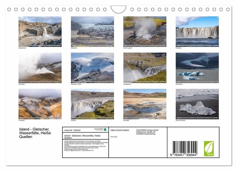 Tauchen Sie ein in die atemberaubende Natur Islands mit unserem exquisiten Island-Kalender, der die majestätischen Wasserfälle, mächtigen Gletscher und farbenprächtigen Landschaften mit heißen Schwefel-Quellen dieser faszinierenden Insel festhält. Die Erde in ihrem Urzustand. Das versucht, unser Kalender Ihnen nahezubringen.