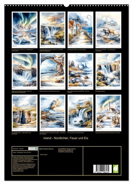 Island - ein Land voller Kontraste, wo Feuer und Eis auf magische Weise verschmelzen. In diesen grandiosen KI-BIldern erwachen die rauen, unberührten Landschaften in stimmungsvollen Aquarellen zum Leben. Gewaltige Wasserfälle stürzen in die Tiefe, während darüber die Nordlichter in schillernden Farben den Himmel erleuchten. Ein qualmender Vulkan erzählt von der unbändigen Kraft der Erde, während schneebedeckte Gipfel und weite, einsame Landschaften die stille Erhabenheit der Natur einfangen. Jeder Monat entführt in eine Welt, die zugleich wild und poetisch ist - ein faszinierendes Spiel der Elemente, das Island so einzigartig macht.