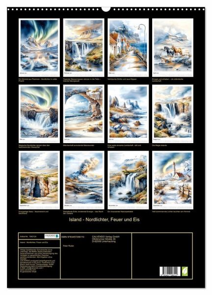 Island - ein Land voller Kontraste, wo Feuer und Eis auf magische Weise verschmelzen. In diesen grandiosen KI-BIldern erwachen die rauen, unberührten Landschaften in stimmungsvollen Aquarellen zum Leben. Gewaltige Wasserfälle stürzen in die Tiefe, während darüber die Nordlichter in schillernden Farben den Himmel erleuchten. Ein qualmender Vulkan erzählt von der unbändigen Kraft der Erde, während schneebedeckte Gipfel und weite, einsame Landschaften die stille Erhabenheit der Natur einfangen. Jeder Monat entführt in eine Welt, die zugleich wild und poetisch ist - ein faszinierendes Spiel der Elemente, das Island so einzigartig macht.