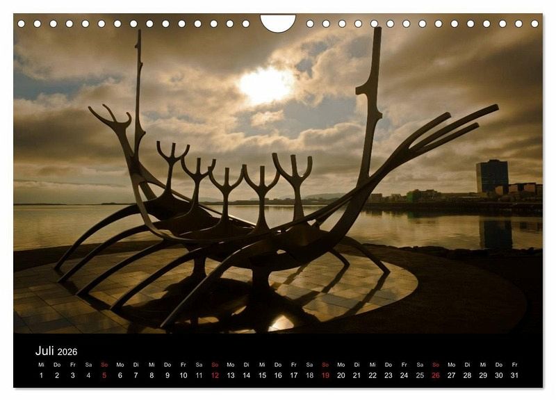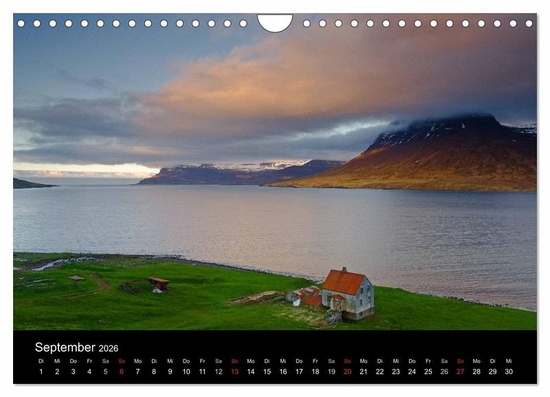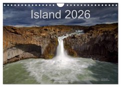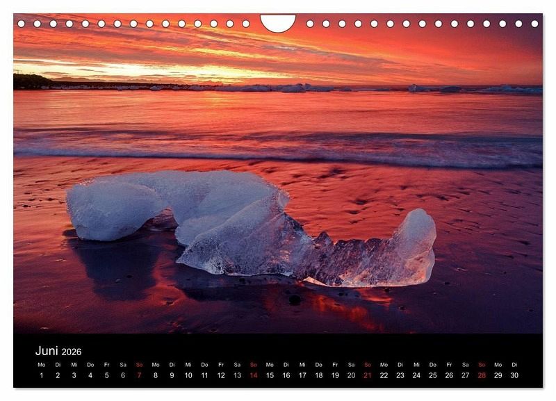 Der Kalender zeigt die traumhaften Landschaften Islands. Er zeigt die Lavasand-Strände, die von Gletschern bedeckten Berge, die tosenden Wasserfälle, das Eis der Gletscher und das faszinierende Nordlicht.