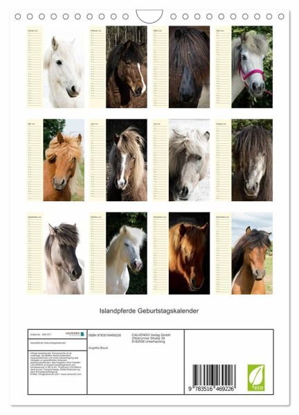Keinen Geburtstag mehr vergessen und jeden Monat in das freundliche Gesicht eines Islandpferdes schauen! Das bietet Ihnen dieser Kalender mit ausdrucksstarken Islandpferdeporträts. Auch ein willkommenes Geschenk für jeden Islandpferdefreund.